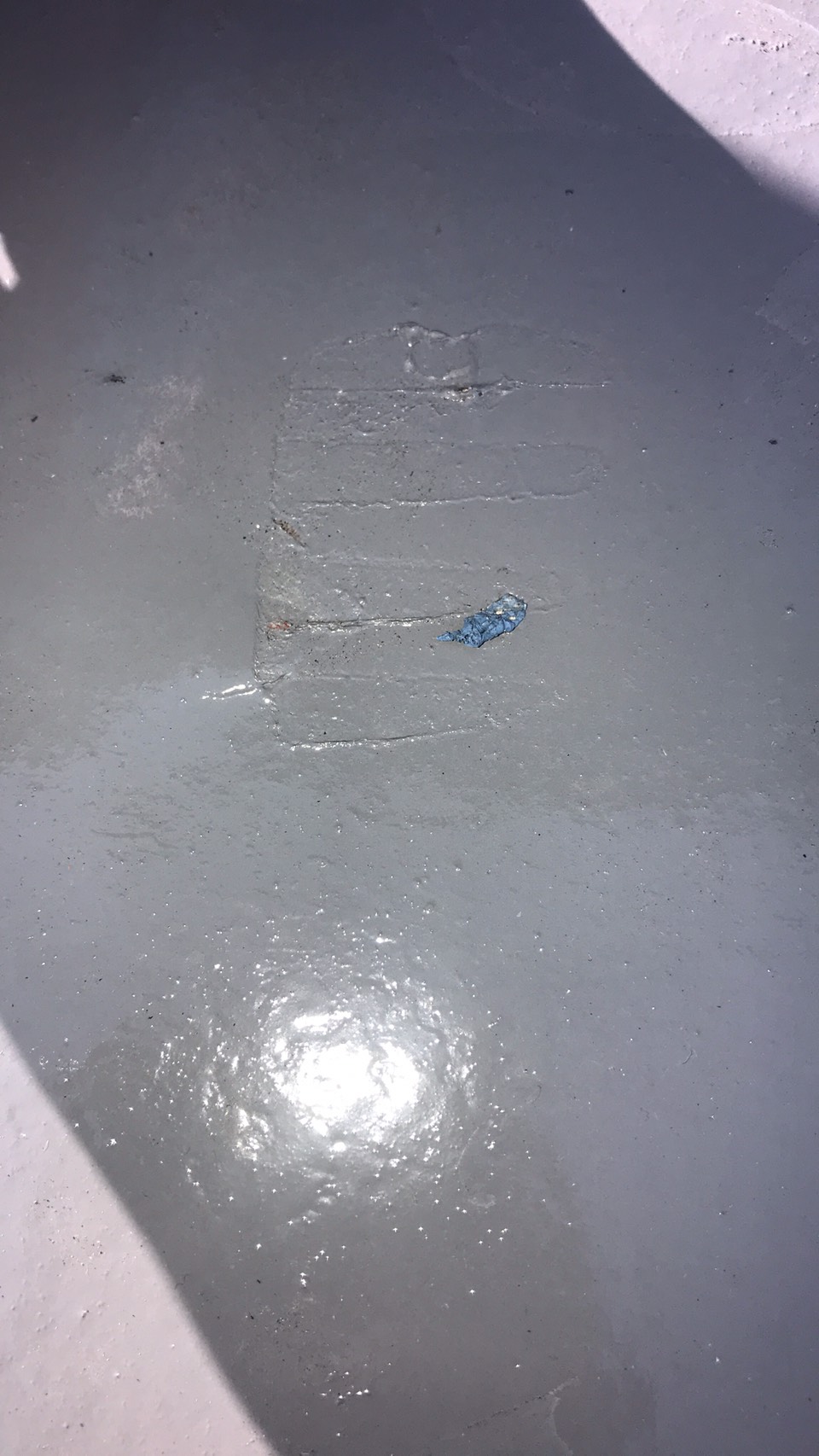 ベランダウレタン防水検査ごお客様が発見しすぐに職人を行かせて修復しました。基本当日に修復をします。 塗装などは検査時に一緒に職人と周り補修しながら検査をしていきます。 外壁塗装、屋根塗装は翌日に補修したりするのがほとんどです。足場を解体した後に補修をしないといけないので足場解体の職人と一緒に解体しながら補修を行なって行く事も多々あります。 足場を解体した後にお客様が気になる部分を発見する事もあります。その時はすぐにご連絡下さい。営業マンと職人が伺って補修を行います。高い部分はスライダー梯子を持って行き行います。三階建てはベランダから登ります。