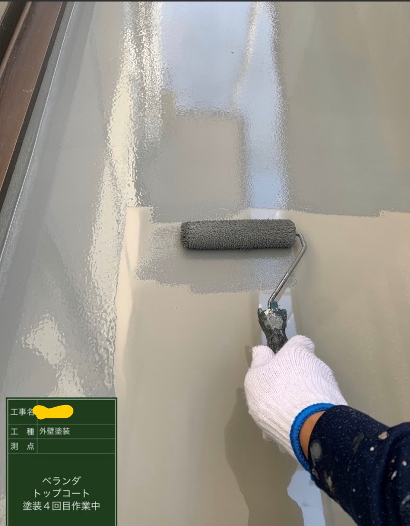 そのため、一層・二層と分け、規定の膜厚を付ける必要がございます。  最後にトップコート塗布作業です。