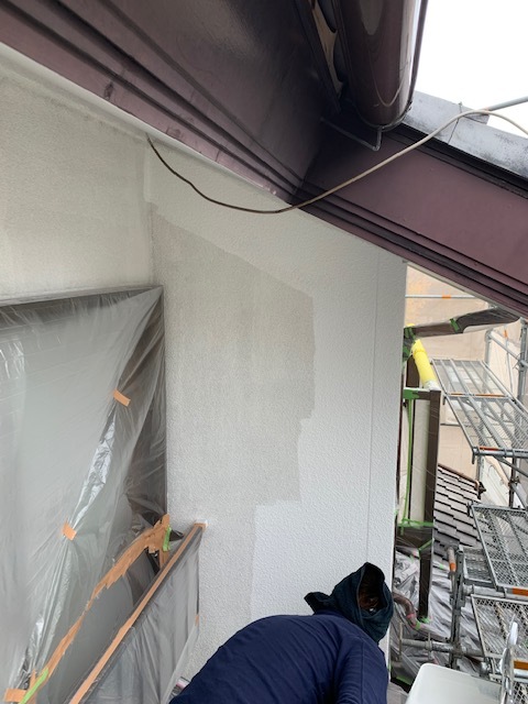 今回は、中塗りは色を変えての施工なので仕上げがベージュなので目立たないように白で塗っていきます。